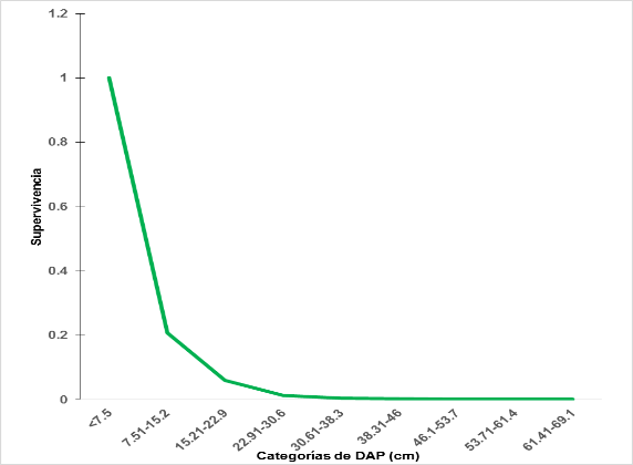 It should be noted that the size categories used in the life tables were modified for a better management of the information, since no individuals were found past the 22.91–30.6 cm diametric interval.