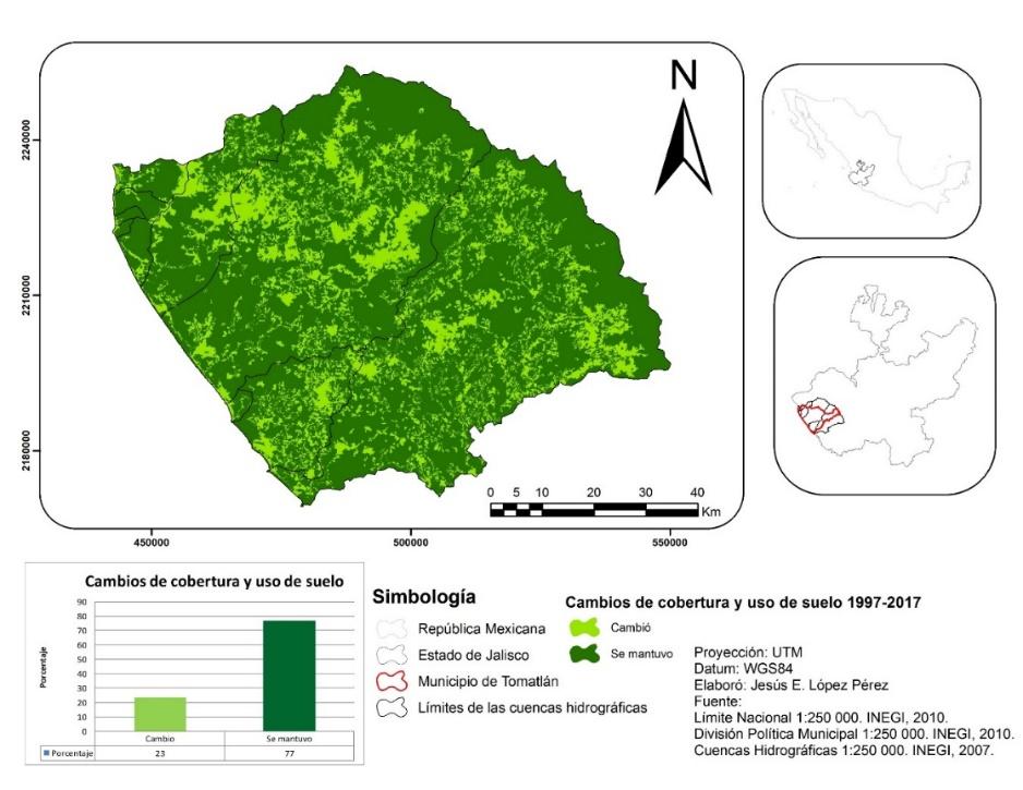 El ejemplo más difundido es la deforestación en las zonas tropicales, donde se estima que la conversión de su cobertura alcanza un promedio de 15.5 millones de ha por año, para el periodo de 1981-1990; lo cual se traduce en una tasa anual de deforestación de 8 % (FAO, 1996). En el presente estudio se analizó el cambio de coberturas y usos de suelo (periodo 1997–2017) en las cuencas hidrográficas que integran al municipio Tomatlán, Jalisco, México. Con este análisis, sobre la dinámica forestal y los cambios de uso de suelo, se podrá estimar el cambio producido en las diferentes clases de uso y ocupación de la tierra, con la finalidad de contribuir a la elaboración de los programas municipales de planeación y ordenamiento ecológico territorial.