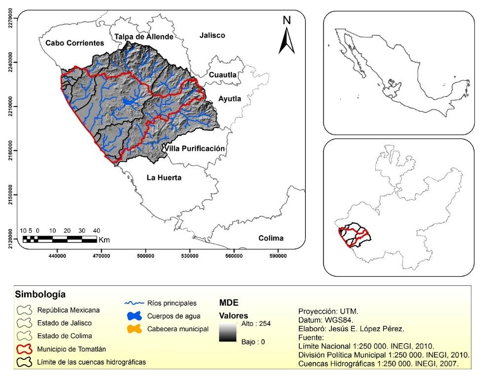 The watershed area that makes up Tomatlán municipality is equivalent to 552 680 ha (Figure 1). According to the Comisión Nacional del Agua (National Water Commission) (Conagua), it belongs to the VIIIth Administrative Hydrological Region, Lerma-Santiago-Pacific, and to the 16th Hydrological Region, Armería-Coahuayana, and includes the watersheds of Ipala, María García, Tomatlán A, Tomatlán B, and San Nicolás A rivers (CEA, 2015). It is located in western Jalisco, at 19°56’3" N and 105°14’8" W (Inegi, 2009). The study area is included in a decree on water reserves for the environment, issued on June 6, 2018 (DOF, 2018).