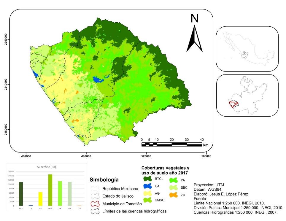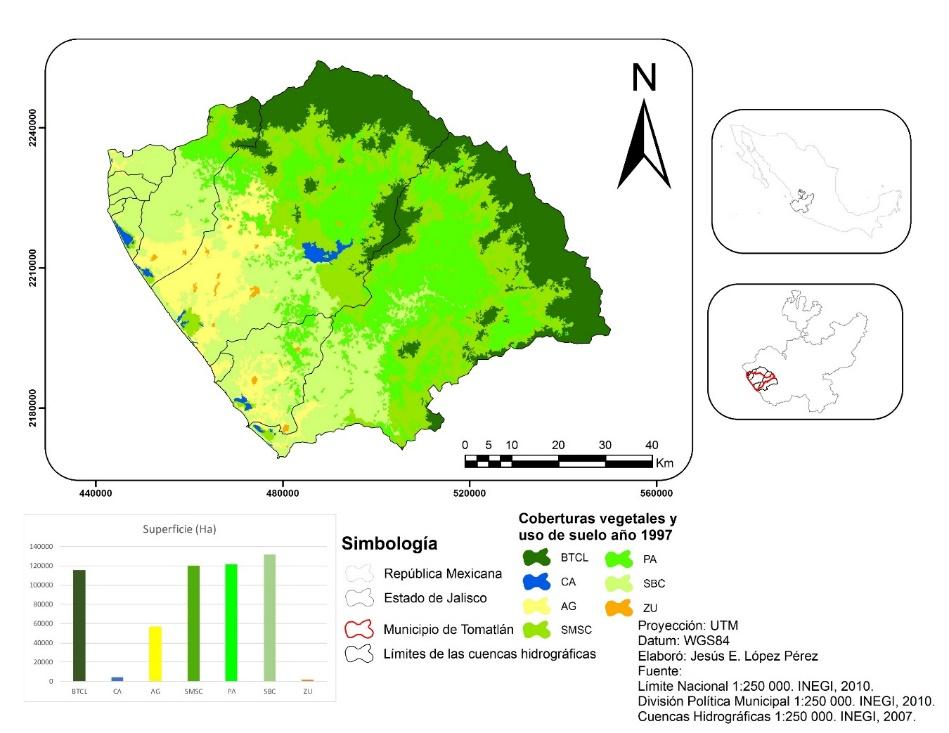 The forest dynamics and land use in the hydrographic watersheds that integrate Tomatlán municipality, Jalisco State (1997-2017) were analyzed. To fulfill this objective, three satellite images were classified: Landsat 5 and 8 (P030 and R046). As a result, two thematic maps were generated with seven types of forest cover and land uses: urban areas, agriculture, grassland, water bodies, medium semi-deciduous forest, deciduous low forest and temperate conifer and broadleaf forest. The map was compared to calculate the change in coverage present at different times. The exchange rate for the 1997-2017 period was determined; the percentage of forest covers that remained was 77 %; and change corresponded to 23 %. Results show that, over the analyzed period, the forest cover that had the greatest gains was the medium semi-deciduous tropical forest with a 1 % increment; the water bodies exhibited a change rate of 1.2 % per year. The gain or increase in this cover is considered to be related to the abandonment of agricultural and livestock areas, which has resulted in a regeneration of the medium growth semi-deciduous forest, while the water bodies are decreasing mainly in the lower parts of the basins, due to the expansion of agricultural areas —which may have implications for soil erosion and salinization—, as well as to changes of the natural landscape.