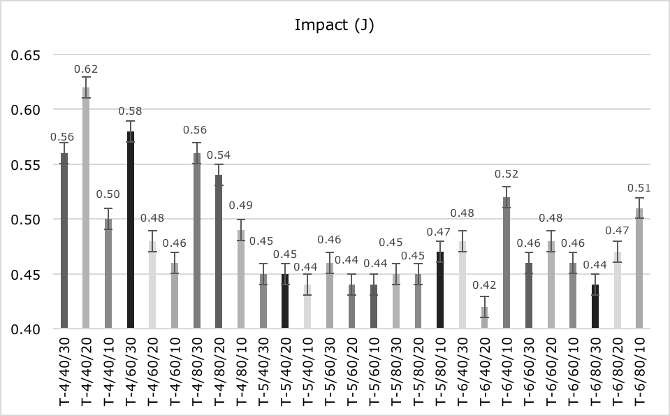 Figure 6 presents the average values of impact resistance for all samples of the PP- White Bolaina composite material. Values range from 0.62 to 0.46 J for year 4, from 0.47 to 0.44 J for year 5 and from 0.52 to 0.42 J for year 6.