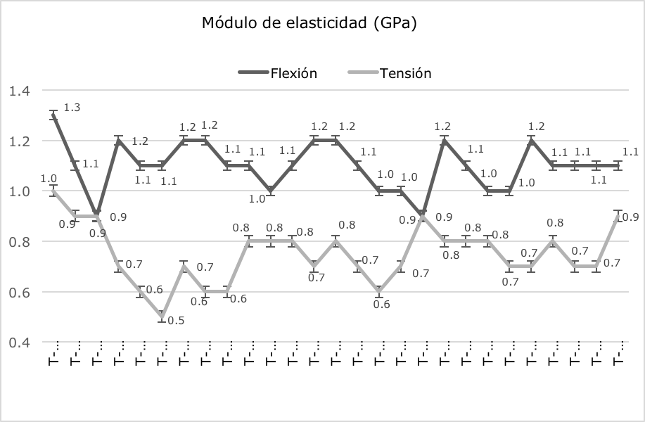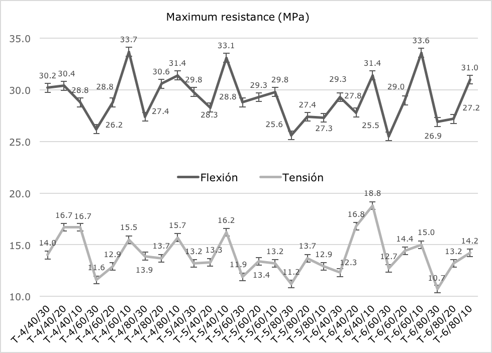 A significant increase in the MOR values in tension is observed when the proportion of wood particles in the composite material is reduced (p = 0.0001). This phenomenon has been pointed out by other researchers (Klyosov, 2007; Ravi et al., 2014), who agree that high concentrations of wood particles reduce the MOR of the composite material.