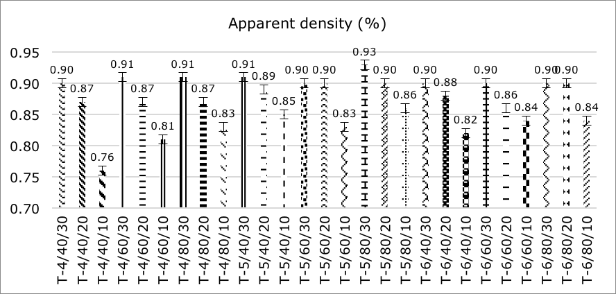Figure 2 shows the average values of apparent density for all samples of the PP- White Bolaina composite material. Values range from 0.91 to 0.76 g.cm-3 for year 4, from 0.93 to 0.83 g.cm-3 for year 5 and from 0.90 to 0.82 g.cm-3 for year 6. Age 5 years records the highest values in apparent density; however, both the anatomical and chemical characterization performed on the G. crinita fibers had little difference among the three ages under study.