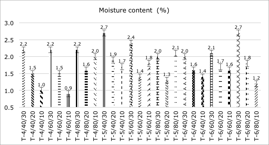 Statistical analysis indicated that the variables age and mixing ratio had a highly significant influence (p≤0.0041). The double age * particle size interaction and the triple interaction behaved in a similar way on the moisture values (p ≤0.0040).