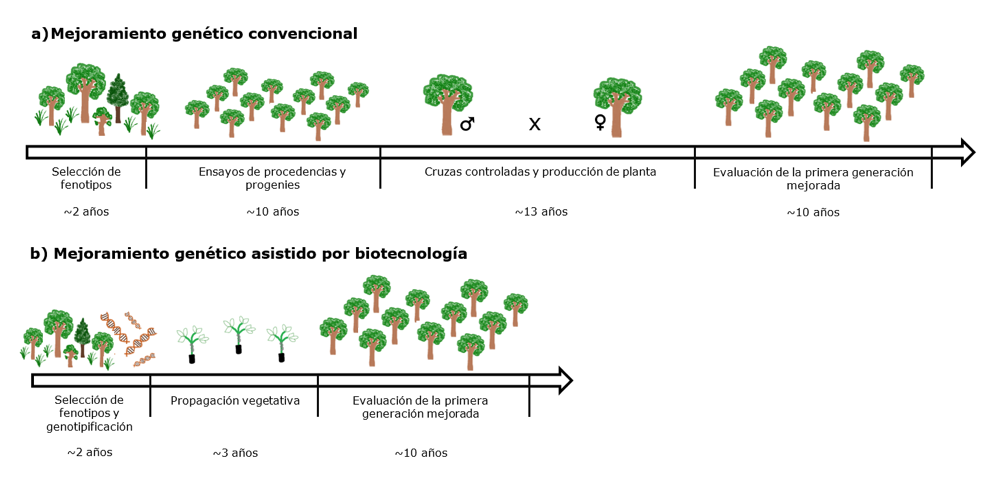 El mejoramiento genético tiene como objetivo desarrollar variedades de alto valor económico, ecológico o social e implica procesos reiterados de actividades como selección, cruzamientos dirigidos y evaluaciones genéticas (White et al., 2007). Una de las principales estrategias del mejoramiento genético clásico consiste en la selección fenotípica de los mejores individuos maduros, seguida del establecimiento de ensayos de procedencias y progenies para estimar los componentes genéticos y ambientales (Zobel y Talbert, 1988). Sin embargo, los métodos tradicionales son limitantes por los largos ciclos reproductivos de la mayoría de las especies forestales, lo que representa varios años e incluso décadas para la obtención de resultados, en función de su biología (Figura 1)(Grattapaglia, 2017).