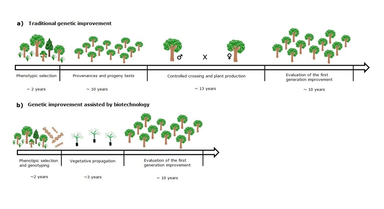 Biotechnology, particularly molecular biology, offers opportunities for genotyping superior individuals, performing Marker Assisted Selection (MAS), as well as studying genome organization and gene functioning associated with characters of economic importance, among others. One of the main advantages of the new technologies is to reduce the duration of improvement cycles; for example, MAS would allow early selection of characters that are expressed at maturity (Grattapaglia, 2017), or, predictions based on quantitative genomic traits would save time during the evaluation stage (Figure 1) (Park et al., 2016), as estimated for the conifer Picea abies (L.) Karst, where traditional improvement cycle requires more than 28 years and can be reduced to less than 10 by means of these tools (Lenz et al., 2019).