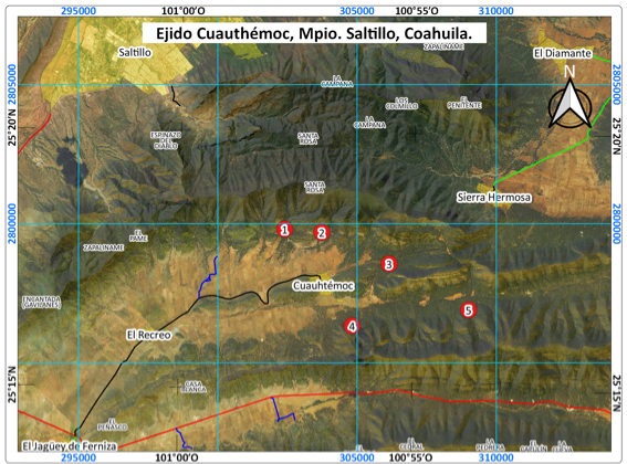 The study was carried out in Cuauhtémoc ejido, in Saltillo, Coahuila, located at 25°17'3.61" N and 100°56'57.99" W (RAN, 2018) (Figure 1). The soil type is Leptosol (Inegi, 2006 a); the climate is BS1kw (semi-arid, temperate); the mean annual temperature ranges between 12 and 18 °C, and the precipitation, between 500 and 800 mm (Inegi, 2006b; Inegi, 2007; Inegi, 2008). The vegetation consists of conifer forests, rosetophile scrubs, sub-montane shrubs and grasslands (Profauna, 2008).