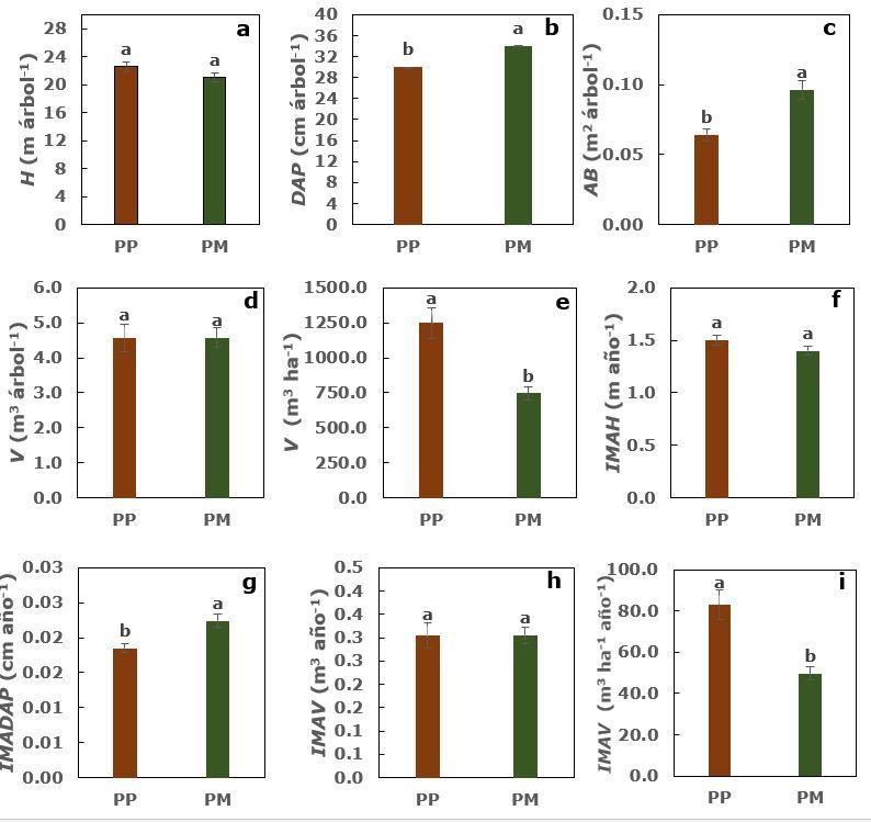 Medias con distintas letras en cada barra (error estándar) son estadísticamente diferentes (Tukey, p ≤ 0.05). a) Altura total (H); b) diámetro a la altura del pecho (DAP); c) Área basal (AB); d) Volumen (V); e) Volumen por superficies (V); f) Incremento medio anual en altura total (IMAH); g) Incremento medio anual en diámetro (IMADAP); h) Incremento medio anual en volumen (IMAV); i) Incremento medio anual en volumen por superficie (IMAV ha-1año-1).