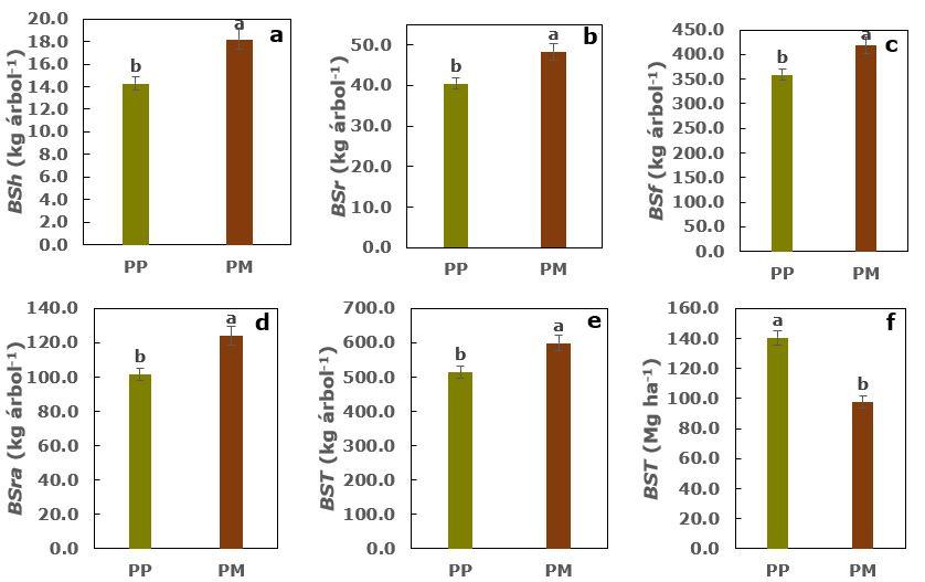 *Medias con distintas letras en cada barra (error estándar) son estadísticamente diferentes (Tukey, p ≤ 0.05). a) Biomasa seca de hojas (BSh); b) Biomasa seca de ramas (BSr); c) Biomasa seca del fuste (BSf); d) Biomasa seca de la raíz (BSra); e) Biomasa seca total (BST), y f) Biomasa seca total por superficie (BST).