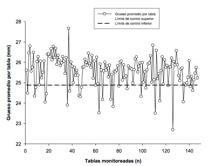 The variation of the average thickness in sawn boards recorded extreme values of 22.5 to 27.66 in green timber (Figure 1). The result of this situation was that only 98 of the 150 sample boards were within the estimated control limits of 24.88 to 26.20 mm; 26 boards surpassed the top control limit of (26.20 mm), leading to economic losses as they amount to 1.59 delivered board feet that were not charged to the customer due to oversizing; another 26 had a thickness below the bottom control limit (24.88 mm) involving a shortage of 3.41 board feet, and the undersized shipped product was therefore also rejected.