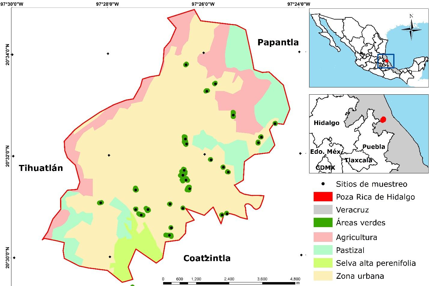 El estudio se desarrolló en el municipio Poza Rica de Hidalgo, Veracruz, México, ubicado entre las coordenadas 20.53 N y -97.45 O (Figura 1), con un área total de 4 688 ha. Poza Rica posee un grado de desarrollo humano muy alto por la zona petrolera en la que se ubica y una tasa media anual de incremento poblacional de 0.73 %, lo que en 2015 le significó contar con 200 119 habitantes (INEGI, 2015). El clima de la ciudad está clasificado como Aw (cálido húmedo) con una temperatura media anual de 24.5 °C, una precipitación promedio de 1 106 mm y una altitud inferior a los 200 m (INEGI, 2016).