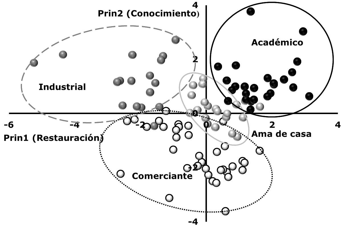 From the Principal Components Analysis (ACP) it turned out that in the first component (Prin1) the variables related to the knowledge about the ecosystem services that the green areas provide to the cities were grouped and explains 43.6 % of the total variance; the second (Prin2) groups the Importance of the Restoration of the green areas, and explains 32.72 % (Figure 3). The academics and industrialists showed the highest levels of knowledge about the ecosystem services that urban trees provide to the city; however, those related to the industrial sector were the most reluctant to restore. According to IPCC (2014), this reaction can be explained as sustainable industrial processes production costs increase and profits decrease.