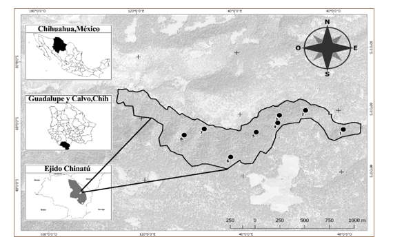 El trabajo de campo se llevó acabo en un bosque mixto constituido principalmente por Pseudotsuga menziesii, Pinus arizonica Engelm. y Quercus tuberculata Liebm.; en el paraje El Triste, que está ubicado dentro del ejido Chinatú, municipio Guadalupe y Calvo, al suroeste del estado de Chihuahua entre los 40º00'00" - 80º00'00" N y 40º00'00" – 160°00'00" O (Figura 1).