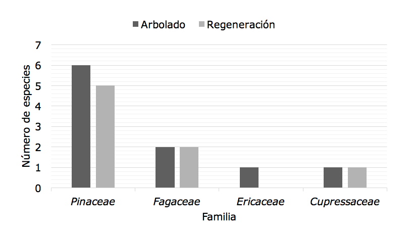 Composition. In the regeneration stage, eight species belonging to six genera of three families were registered (Figure 2). Those with the highest number of species were Pinaceae with five and Fagaceae with two. For the mature plant community (Figure 2), 10 species of seven genera were registered in four families; the families with more species were Pinaceae with six and Fagaceae with two. These results coincide with those of Aragón-Piña et al. (2010), Hernández-Salas et al., (2013) and Graciano (2017), who agreed that these families are widely distributed in the Sierra Madre Occidental, in which the Pinus and Quercus genera stand out. The maximum height of regeneration was 8.0 m and 29 m for mature trees.