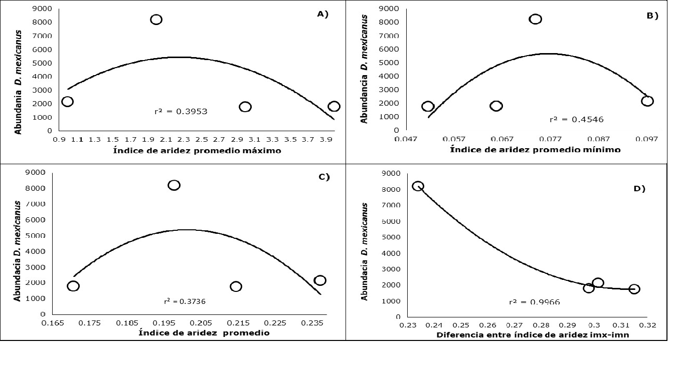 Por otra parte, se observó que los índices de aridez medios máximos para las regiones de Nuevo León, Jalisco y Oaxaca fueron superiores a 0.36, mientras que para la del estado de Hidalgo fue de 0.30; esto es indicativo de una elevada probabilidad de que los índices de aridez máximos o mayores a 0.30 pueden limitar la abundancia de D. mexicanus. Desafortunadamente, no hubo una relación entre su abundancia y el índice de aridez promedio máximo (r2=0.39), abundancia - índice de aridez promedio mínimo (r2=0.45) y abundancia - índice de aridez medio (r2=0.37) (Figura 4, A, B, C). Se determinó una relación entre la abundancia y la variación entre los índices de aridez máximo y mínimo; de tal manera que resultó menor la abundancia de descortezadores, cuando la diferencia entre los extremos fue más pronunciada, y si la diferencia entre los extremos del índice de aridez fue menor, la abundancia promedio fue superior en los sitios de muestreo (Figura 4, D).