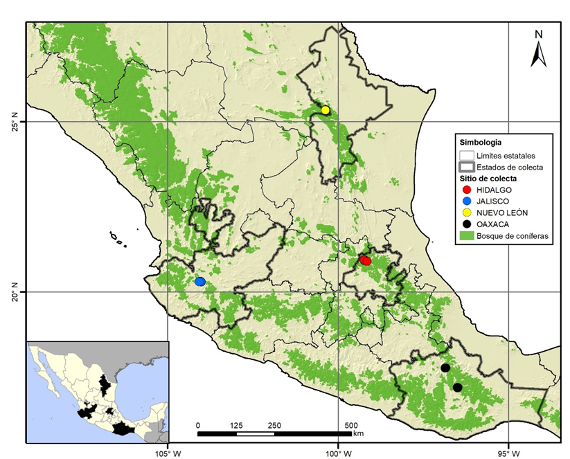 Para cubrir el intervalo de distribución natural del bosque de pino-encino de México, se realizó un muestreo de D. mexicanus en cuatro regiones dentro de los estados de Nuevo León (1 950 - 2 650 msnm), Hidalgo (1 342 - 2 611 msnm), Jalisco (1 999 - 2 306 msnm) y Oaxaca (2 113 - 2 889 msnm) (Figura 1). En cada región, se colocaron ocho trampas de recolección de insectos de Lindgren Synergy Semiochemicals Corps®, compuestas de ocho embudos, siguiendo un transecto altitudinal entre 1 300 y 2 900 m, que corresponden con áreas adecuadas para la presencia de descortezadores del género Dendroctonus.