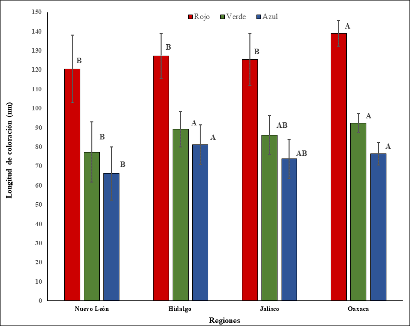 Figura 2. Prueba de medias de Tukey (α=0.5) para longitud de coloración (rojo, verde y azul) entre los estados de la república mexicana estudiados.