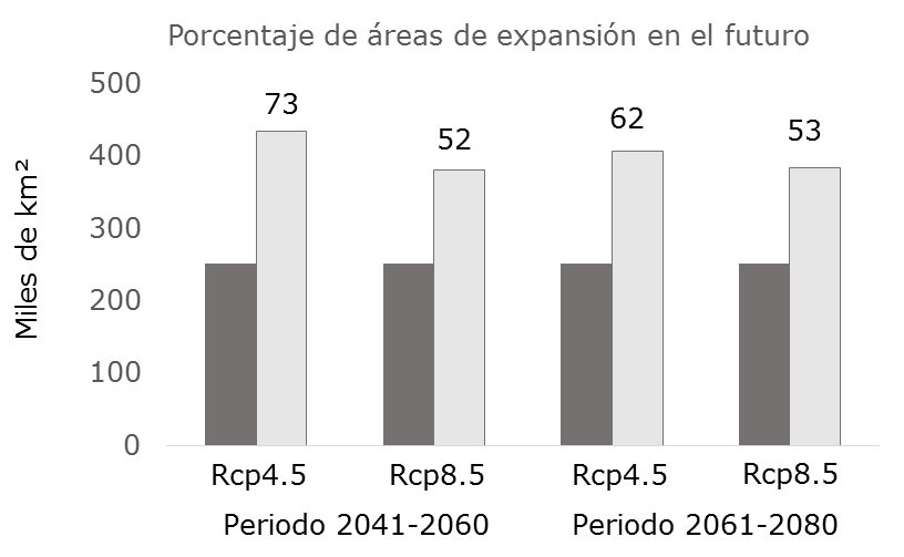 Figure 4. Percentage of expansion of the areas with environmental aptitude (in dark gray) with respect to the reference climate in the 2041-2060 and 2061-2080 periods for two RCPs (4.5 and 8.5).