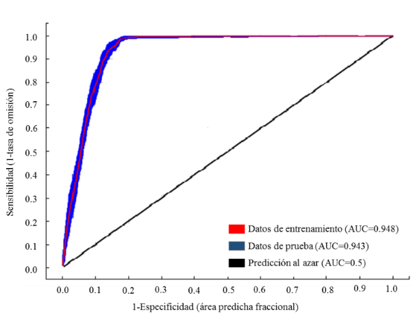 Through the ecological niche model, the MaxEnt model predicts the relative occurrence rate (ROC curve) of the species, as a function of the environmental predictors in each locality (Merow et al., 2013); in turn, the area under the curve (AUC) is interpreted as the adjustment of the model, in which a value of 1.0 would be a perfect classifier and a random classifier would have a value of 0.5 (Phillips et al., 2006), and therefore, those that are close to 1.0 show a better fit of the model to the data.