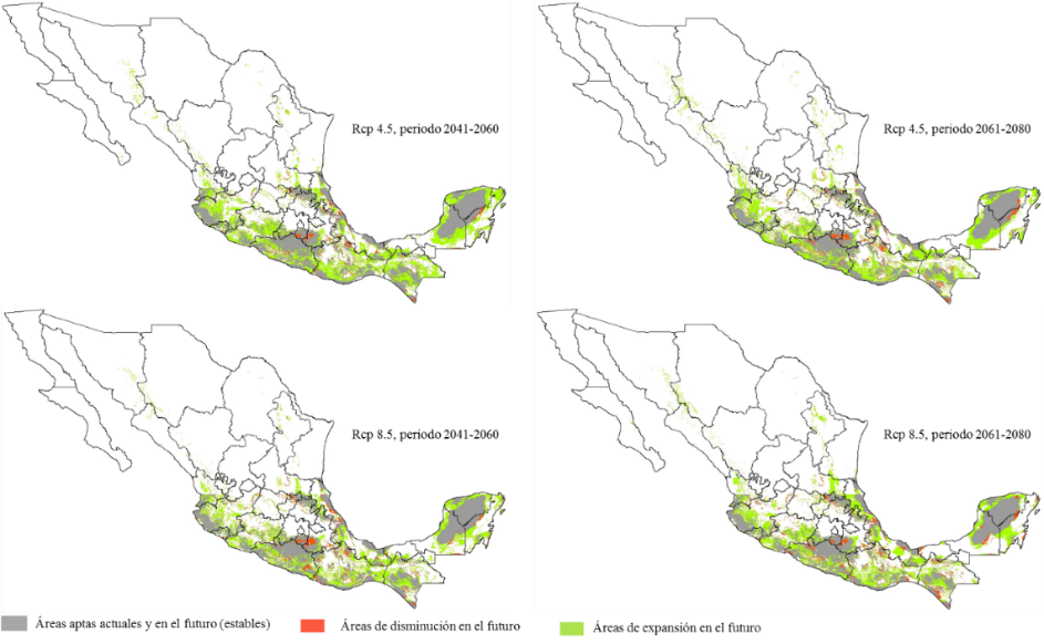 The above shows that the areas with environmental aptitude are sensitive to the climate simulation variations of the RCPs, even in the models that are considered to be similar in the prediction of the climate change for Mexico (Conde et al., 2006).