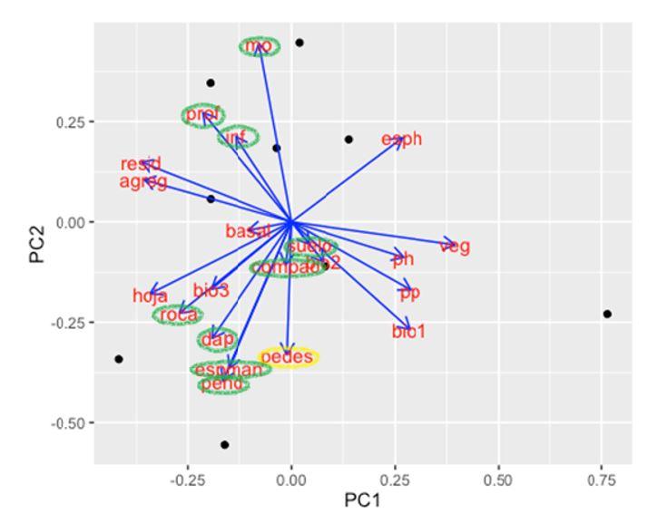 En el análisis de exploración mediante Componentes Principales (ACP) que se exhibe en la Figura 4, las variables que resultaron importantes para explicar la presencia de pedestales (enmarcado con color amarillo) fueron: suelo desnudo, compactación, pendiente, espesor del mantillo, rocas y DAP; las cuales, tuvieron una correlación positiva. La materia orgánica, infiltración y profundidad del suelo presentaron una correlación negativa (enmarcadas con color verde). En este caso, a mayor magnitud de las variables, menor erosión en forma de pedestales. Estos resultados son acordes a lo esperado, ya que los suelos profundos y contenidos altos de materia orgánica favorecen su capacidad de infiltración y son suelos muy estables, lo cual reduce los riesgos de erosión.