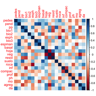 Para identificar los factores importantes en la explicación de la erosión hídrica, se realizó una matriz de correlación de Pearson entre las covariables seleccionadas y la variable respuesta. Para el análisis se utilizaron, únicamente, los datos de erosión en forma de pedestales, ya que para canalillos y cárcavas se tuvo un solo registro.