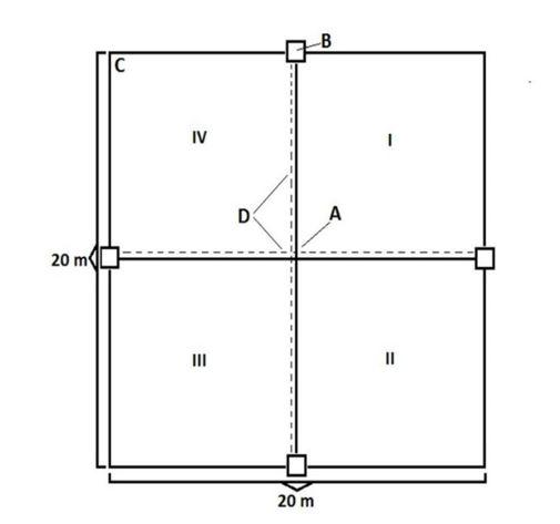 I, II, III y IV = Cuadrantes; A, B, C y D = Mediciones que se detallan en la descripción del levantamiento de la información.