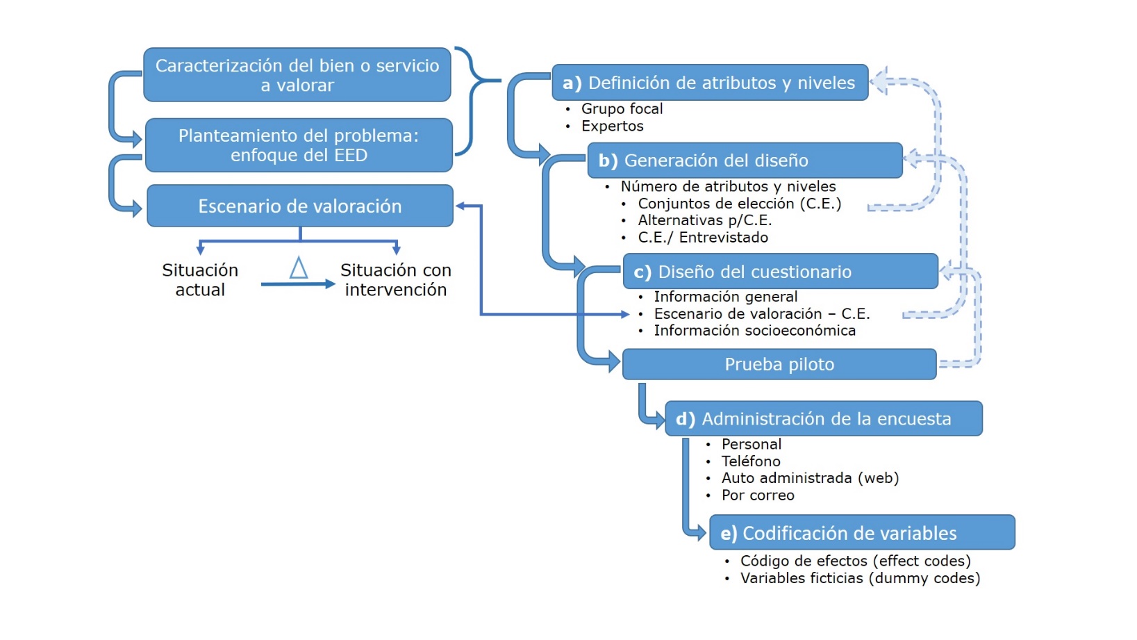 El procedimiento de EED comprende las siguientes etapas: A) diseño del EED y B) procedimiento de estimación y determinación de la DAPMg. En esta sección se aborda la etapa del Diseño del EED, que a su vez incluye: a) definición de atributos y niveles de provisión; b) generación del diseño experimental; c) desarrollo del cuestionario; d) administración de la encuesta; y e) codificación de variables. Cada uno de ellos deberá realizarse de manera exhaustiva y será posible retroalimentar, de manera secuencial, las áreas de mejora identificadas en el diseño final del EED. En la Figura 1 se resume la etapa del diseño del experimento de elección.