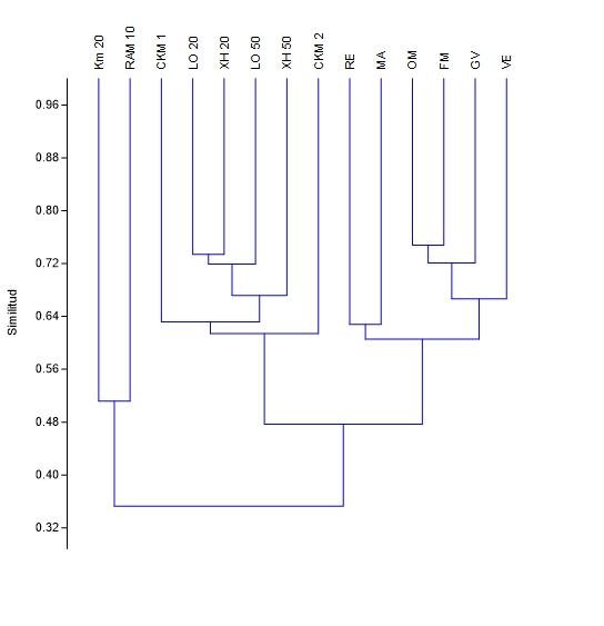 Km 20 = Km 20; RAM = Ramonal; CKM1 = Calakmul 7-10 years; LO 20 = Laguna Om 20 years; Xh 20 = Xhazil 20 years; LO 50 = Laguna Om 50 years; Xh 50 = Xhazil 50 years; CKM2 = Calakmul 20 years; MA = Manuel Ávila Camacho; FM = Francisco Mújica; OM = Otilio Montaño; RE = Río Escondido; VE = Veracruz; GV = Guadalupe Victoria; Similitud = Similarity