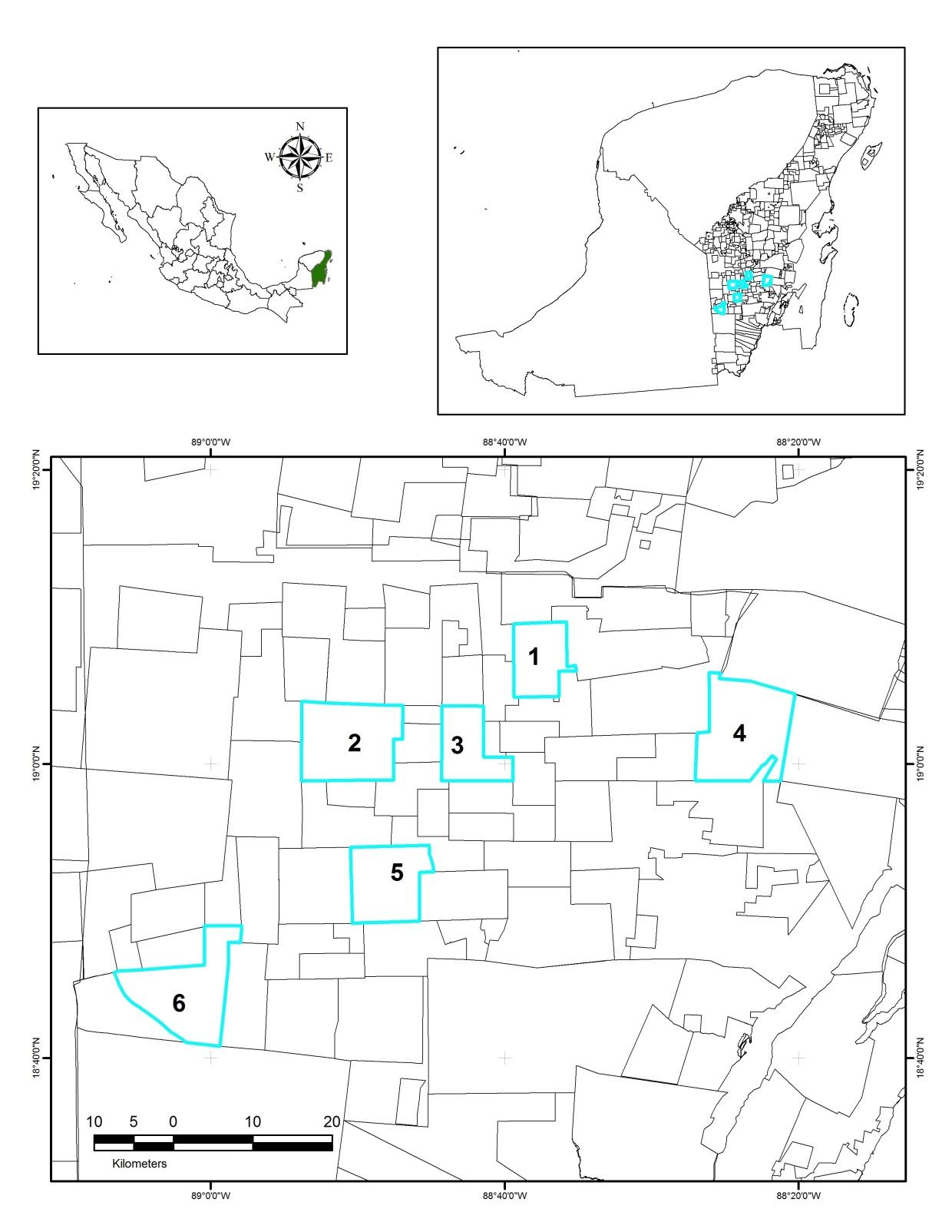 The six forest ejidos are located in the Othón P. Blanco and Bacalar municipalities, in the state of Quintana Roo (Figure 1). The information in this study comes from the databases associated with the timber and non-timber forest management programs, called Unified Timber Forestry Procedures, which were presented, submitted and validated in 2016, by six ejidos to the State Forestry Council of Quintana Roo, for authorization by the Ministry of the Environment and Natural Resources.