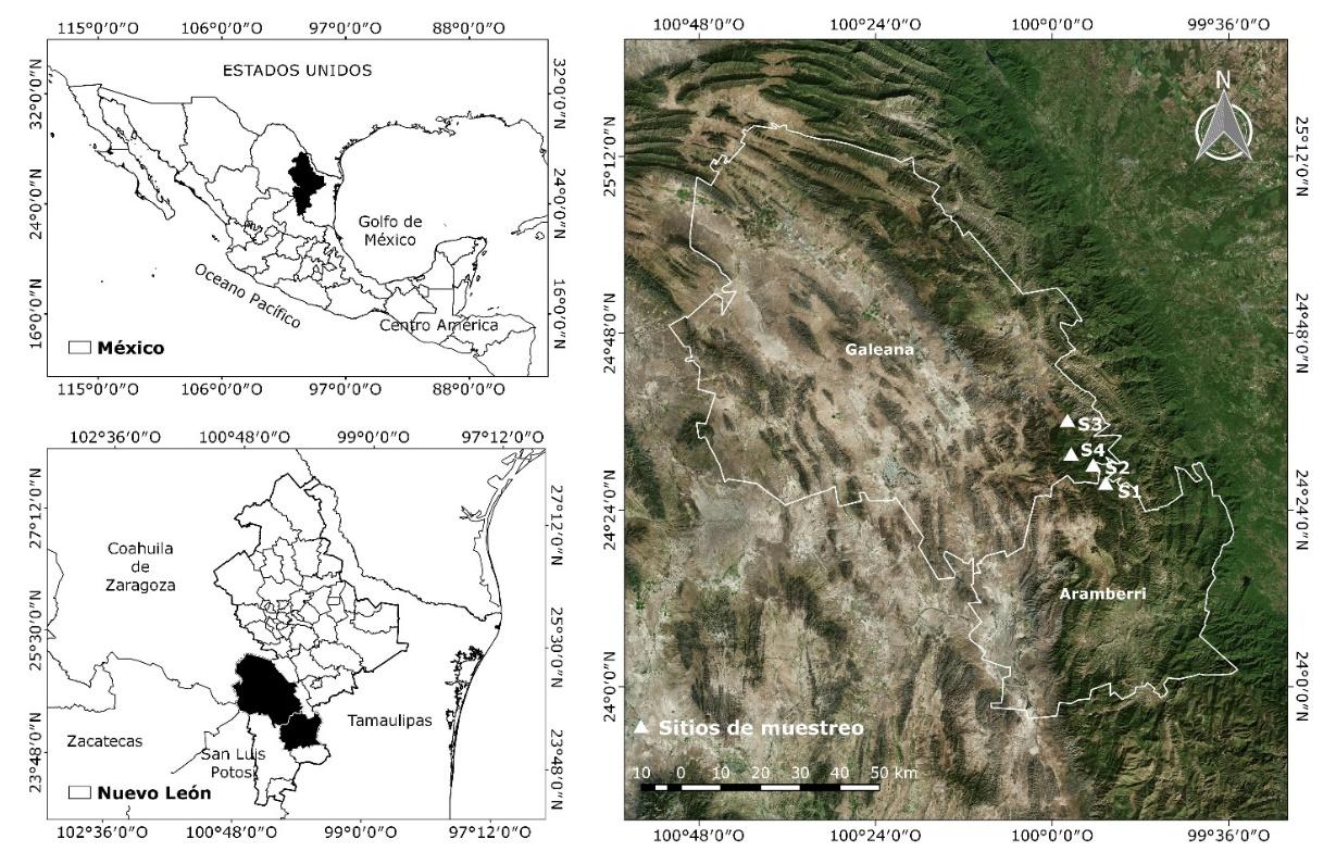 El trabajo de campo se llevó a cabo durante el invierno del año 2019, en cuatro localidades de bosque mixto de pino-encino, ubicados en el sistema montañoso de la Sierra Madre Oriental, con una distancia aproximada de 5 km entre ellos; tres se localizan en el municipio Galeana y uno en el municipio Aramberri en el estado de Nuevo León, México; entre los 23°43'51'' - 25°26'45'' N y los 99°28'30'' - 100°55'48'' O (Figura 1).