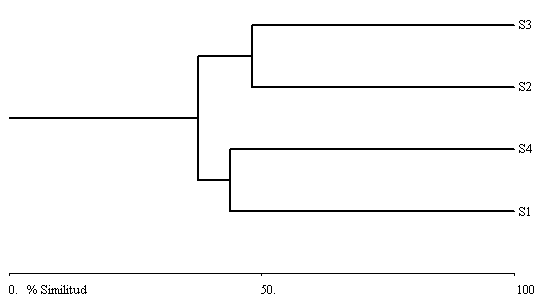 Para determinar la semejanza en la composición de las especies entre las cuatro localidades, se aplicó un análisis con el programa BioDiversity Professional versión 2.0 (McAleece et al., 1997), mediante un algoritmo que permite analizar la similitud de las muestras a través del cálculo del porcentaje con intervalos de 0 a 100 %, cuyo resultado se representa en un dendrograma de similitud-disimilitud de Bray-Curtis (Bray y Curtis, 1957).