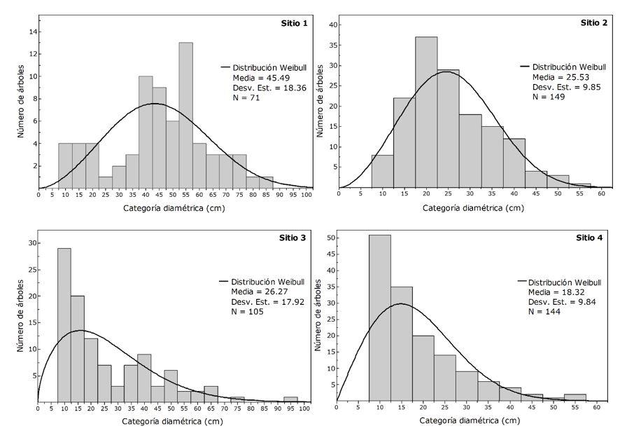 Se utilizó la función de Weibull para crear histogramas de distribuciones diamétricas, los cuales se evaluaron con una prueba de bondad de ajuste de X-cuadrada, con el software Minitab versión 16 (Minitab, 2014). Dicha función se usa en la ciencia forestal por su facilidad de aplicación en análisis semejantes de algunos taxa del género Pinus (Bailey y Dell, 1973).