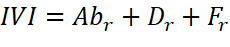 The species importance value index (IVI) was estimated to evaluate the existence of structural changes in the species composition as a consequence of the application of the slaughterhouse cut with plantation. The IVI, developed by Curtis and McIntosh (1951), consists of adding the relative values of density (), dominance () and frequency (). This synthetic structural index is mainly oriented to rank dominance by species in mixed stands (Sánchez et al., 2018). According to Alvis (2009), the general expression of the IVI is the following: