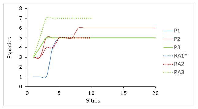 From the information on the number of new species per site, the accumulated richness curves were obtained, to justify that the sampling effort was enough and included most of the species present both in the plantations and in the RAs (Dzib et al., 2014).