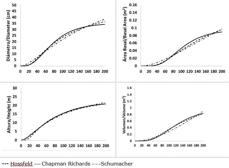 Como complemento del análisis de los resultados, las tendencias de las curvas de crecimiento de los tres modelos previamente seleccionados permitieron determinar que los de Schumacher y Chapman-Richards fueron los que mejor representaron el crecimiento biológico en diámetro normal, área basal y volumen de P. leiophylla; mientras que, a los de Hossfeld I y Chapman-Richards les correspondieron las mejores tendencias sobre el crecimiento en altura. A su vez, el modelo de Schumacher fue el que mejor caracterizó el crecimiento del diámetro normal, área basal, altura y volumen tanto de P. lumholtzii, como de P. strobiformis. En estas últimas especies, el modelo de Chapman-Richards también registró buena tendencia de crecimiento en altura (figuras 2, 3 y 4).