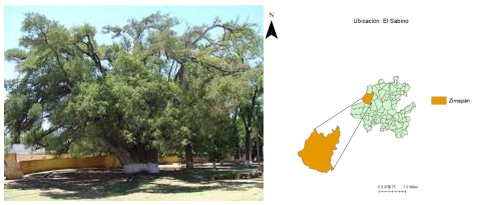 2. El Sabino: nombre científico, Taxodium mucronatum Ten., se ubica en Zimapán Hidalgo, parque El Sabino (Figura 2). Su (DAP) es de 4.6 m y su altura de 25 m. En 1993, El Sabino fue reconocido por el Instituto Nacional de Ecología, como el único Árbol Notable del estado. Se utilizó, según distintas versiones, para ajusticiar a delincuentes en la época de la Revolución Mexicana.