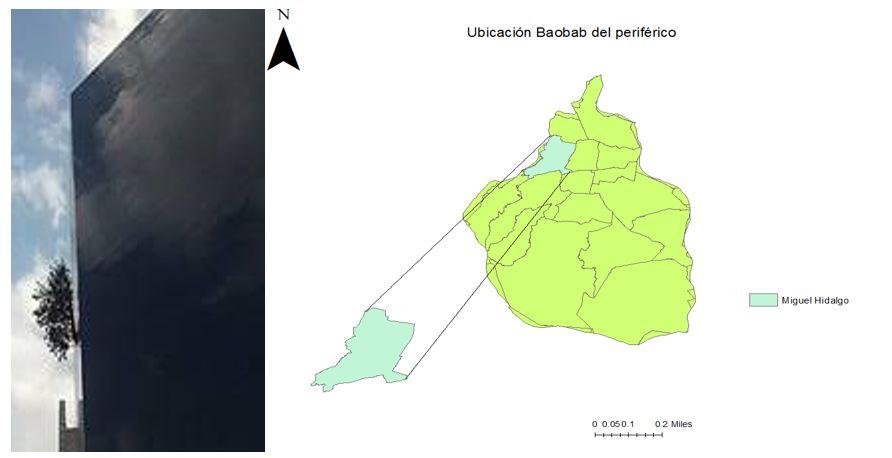 5. El Baobab del periférico: nombre científico, Adansonia digitata L., localizado en Bulevar Manuel Ávila Camacho, Ciudad de México (Figura 5). Este árbol fue colocado por el Arquitecto Víctor Lama, quien decidió establecerlo en los ventanales de un noveno piso, en el marco de una avenida urbana muy transitada. Se encuentra trasplantado en una maceta de dos metros de diámetro, para su sobrevivencia, cuyo interior contiene más de una tonelada de tierra. Cuando El Baobab necesita hidratarse, el macetón cuenta con un mecanismo traído de Europa, que por medio de una fotocelda acciona un sistema de riego.