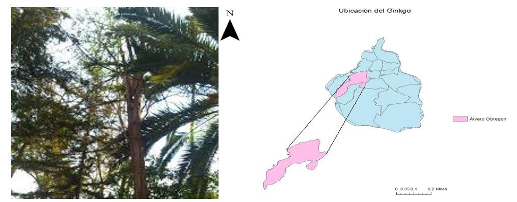 6. Ginkgo: nombre científico, Ginkgo biloba L., se localiza en el parque La Bombilla, alcaldía Álvaro Obregón, Ciudad de México (Figura 6), con un DAP de 0.44 m y altura de 18 m. Se piensa que fue introducido por el Ing. Miguel Ángel de Quevedo, padre de la ingeniería forestal en México; el cual mencionó durante una conferencia en el puerto de Veracruz que: "…en las sociedades modernas, se debe considerar la conservación forestal como una función necesaria y obligatoria del Estado" (Boyer, 2007).