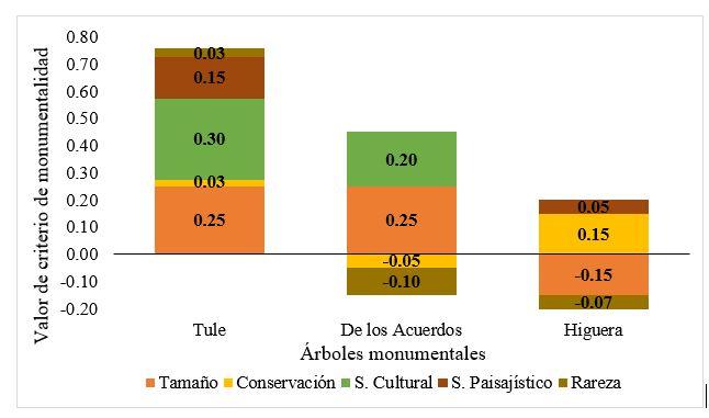 En la Figura 4 se grafican solo los tres árboles con mejor calificación en monumentalidad. El segundo árbol de mayor monumentalidad fue el Árbol de Los Acuerdos, cuyo criterio de mayor aporte fue el Tamaño (0.25). Asimismo, se observan aportes negativos en los criterios: Estado de conservación (-0.05) y Rareza (-0.1), lo cual significa que en ambos criterios, la suma promedio de las preferencias del resto de los árboles, con respecto al Árbol de Los Acuerdos, fue superior. Aun cuando este árbol ocupa el segundo lugar, su valor de monumentalidad (0.30) queda muy distante del valor correspondiente al Árbol del Tule (Figura 4).