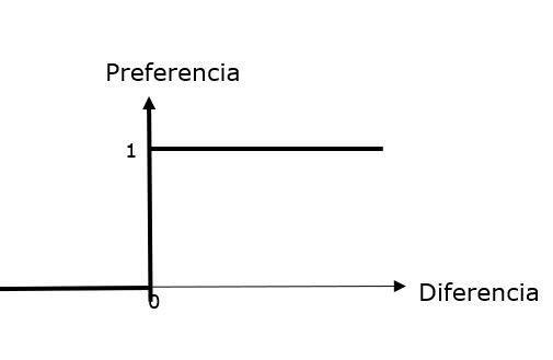 . Las decisiones sobre los grados de preferencia pueden enriquecerse mediante funciones de Preferencia; Brans y De Smet (2016) proponen seis para expresarlas. En este estudio se utiliza la función conocida como usual [Figura 3, y ecuación (1)]; en la cual, los valores de los umbrales de indiferencia y preferencia son igual a cero, lo que significa que ante la más mínima diferencia positiva en