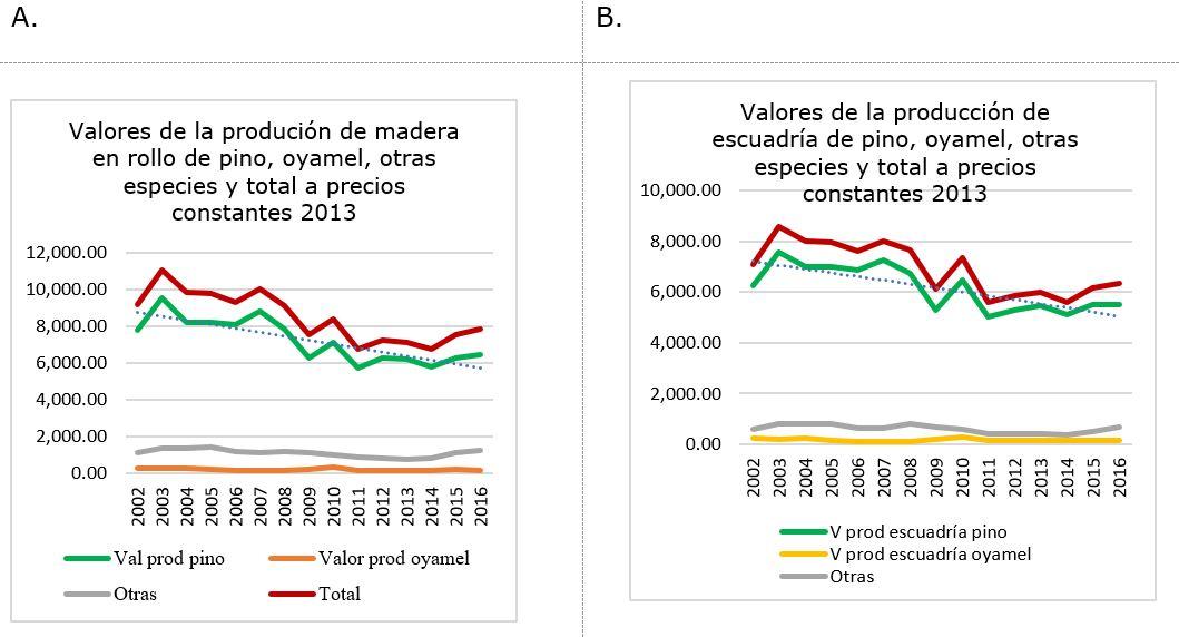 Figure 1A shows the evolution and trend of the production value of forest species as roundwood in millions of constant Mexican pesos (2013). For pine species, the value of timber production showed increases and decreases, almost annually; the maximum value was registered in 2003, without reaching that level again, even its trend was clearly negative.