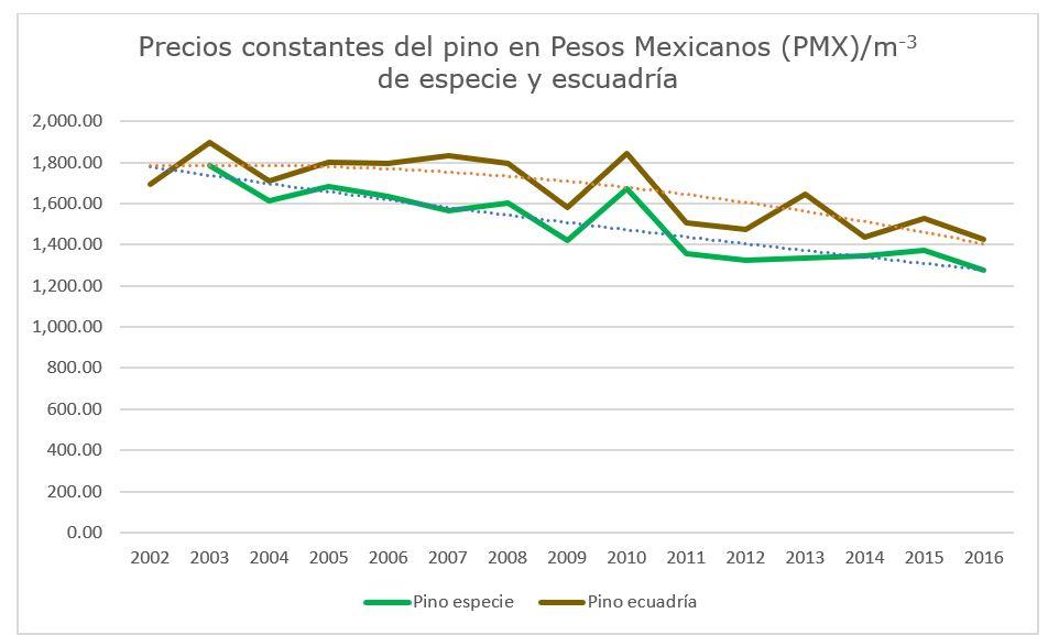 The economic value importance of pine (Pinus spp.) as a natural resource in Mexico is that it is present in 75 % of its surface. This study aims at quantifying the monetary value that pine contributes to the forest economy, based on the statistical data provided by the Ministry of Natural Resources and the Environment; a horizon of 15 years 2002-2016 was selected with the idea of learning about the behavior and evolution of the value of this conifer, as roundwood and as square timber. The methodological process was to update the current values through deflation and display them at constant values, for which 2013 was selected as the base year. The data were thus made comparable in order to identify their trends, as well as to quantify their variation through the statistical function annual average growth rate. In real terms, there is a reduction of the importance of the value of pine, which has a strong influence on market prices. These fail to grow enough to stop the fall in the value of production, a situation that is more prevalent in roundwood than in square timber.