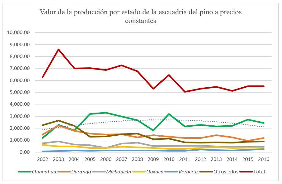 Figure 2. Value in millions of constant Mexican pesos (MXN) (baseline year: 2013) of the pine square timber production nationwide and by states (2002-2016).