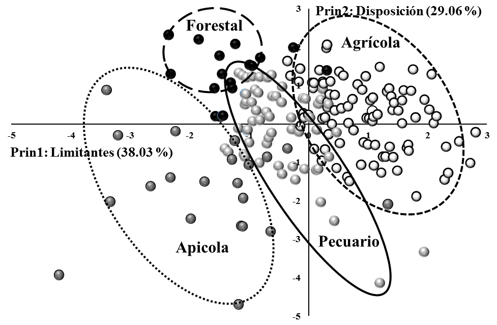 Based on the dispersion of the eigenvalues for each of the 190 surveyed producers, they were grouped and differentiated by activity; the factor that most limits reconversion (X axis: land tenure) with the willingness to reconvert (Y axis) (Figure 2). As may be seen, the agricultural sector presented the greatest willingness, followed by livestock breeding, forestry and beekeeping, in a hierarchical order.