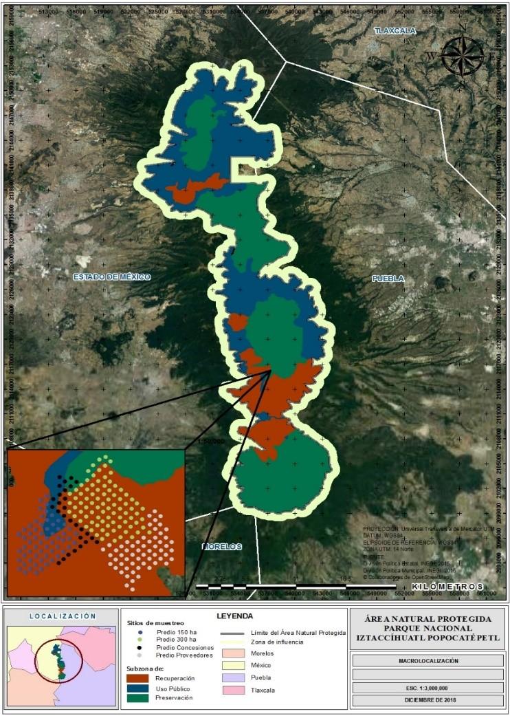 El Programa de Manejo PN Izta-Popo (Semarnat, 2013) está dividido en tres subzonas: Recuperación, Uso público y Preservación; en donde se estableció el área de estudio, en su mayor parte en la subzona de Recuperación (Figura 1).