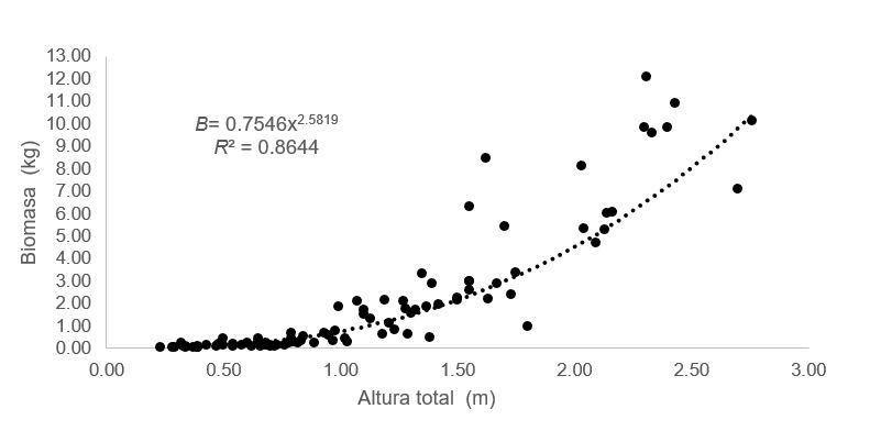 Figura 3. Dispersión de los datos y línea de tendencia de los valores de biomasa relacionando la altura total.