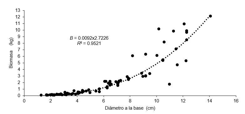 Con los datos de biomasa, se ajustaron los modelos predictivos para cada una de las variables de interés: el diámetro de la base, la altura total y la altura a la primera rama viva. La ecuación en su forma potencial se utilizó para las variables de diámetro de la base y altura total: