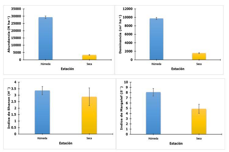 Figura 2. Abundancia (N ha-1), Dominancia (m2 ha-1), Índice de Shannon-Wienner e Índice de Margalef durante las estaciones húmeda y seca del sitio de estudio.