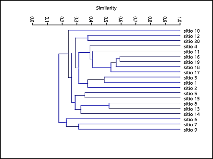 El índice de Jaccard tuvo valores de Ij=38.71, en similitud de especies entre las dos épocas. Los resultados definieron semejanzas entre los sitios 16, 17, 18 y 19 (Ij>0.05) a través del dendrograma (Figura 3), con cobertura (m2*cuadrante) y especies en común, en cada uno de los cuadrantes [Cylindropuntia cholla, Pachycereus pringlei (S. Watson) Britton & Rose y Stenocereus gummosus]. Los de mayor similitud entre las épocas fueron el 16 y el 19 (Ij=0.06) y coincidieron con especies como Acacia farnesiana (L.) Willd., Bourreria sonorae S. Watson, Cylindropuntia cholla, Cnidoscolus angustidens Torr., Krameria parvifolia Benth., Mammillaria armillata, Prosopis articulata, Ruellia californica, Solanum hindsianum Benth., Stenocereus gummosus y Turnera diffusa. El otro grupo de cuadrantes que presentó homogeneidad en cobertura y especies, estuvo constituido por los sitios 8 y 13 (Ij<0.05), con Cylindropuntia cholla, Cnidoscolus angustidens, Ferocactus chrysacanthus (Orcutt) Britton & Rose y Mammillaria armillata.